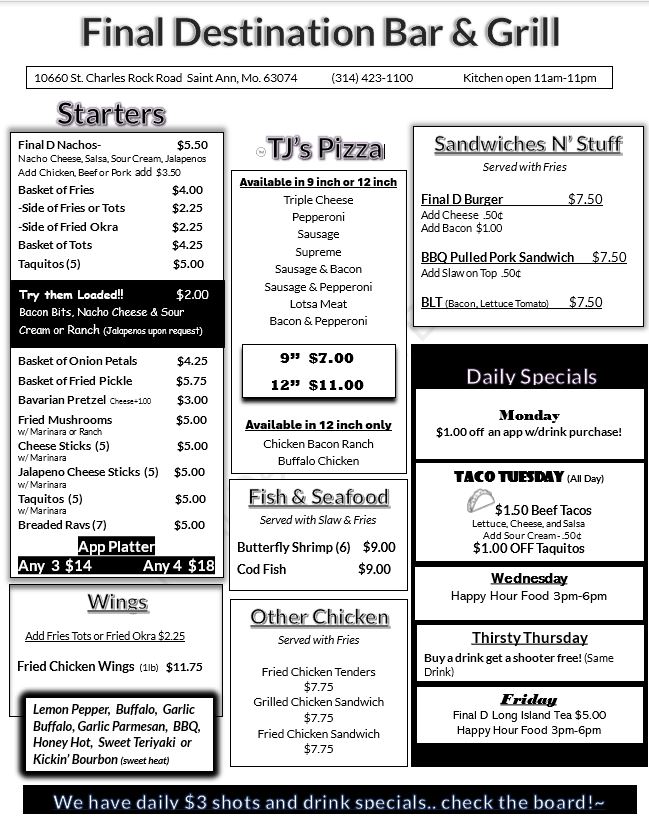 Welcome to Final Destination Bar & Cafe, a hidden gem located at 10660 St Charles Rock Rd in St Ann, MO. This charming spot offers an inviting atmosphere with friendly bartenders and a lively community vibe, perfect for both casual diners and drink enthusiasts.